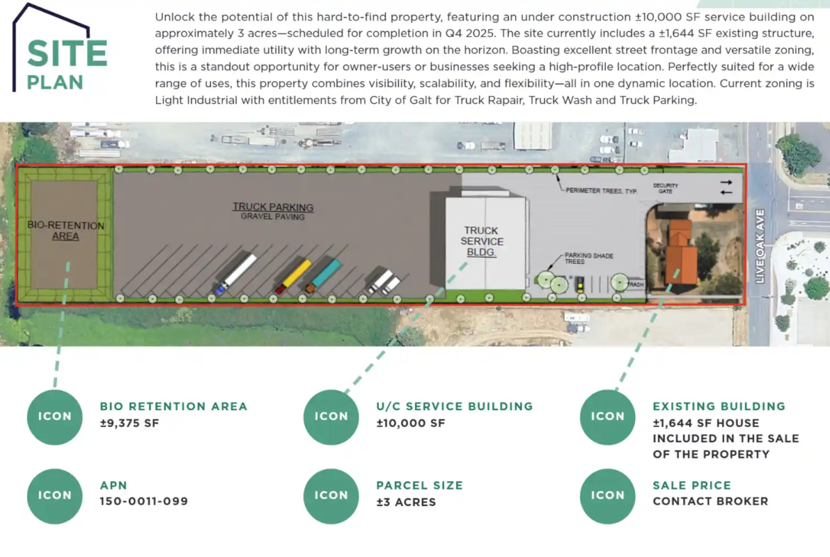 Galt is a strategic industrial hub along the I-5 corridor between Sacramento and Stockton, known for its affordable land, expanding industrial base, and low vacancy. The city supports light industrial and manufacturing growth, and this property has entitlements from the City of Galt for truck repair, truck wash, and truck parking, making it highly versatile for owner-users or businesses seeking high visibility, operational scalability, and long-term growth potential.