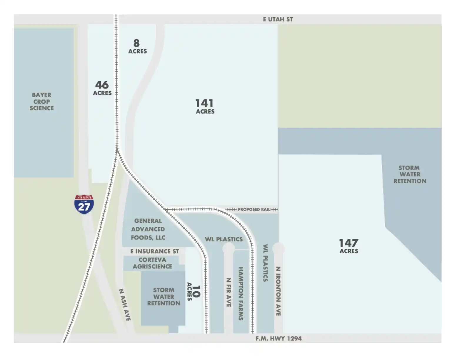 • Lubbock Rail Port:526-acre industrial park with access to BNSF Railway and I-27. Home to Bayer Crop Science, WL Plastics, and Corteva, supporting advanced manufacturing and logistics.