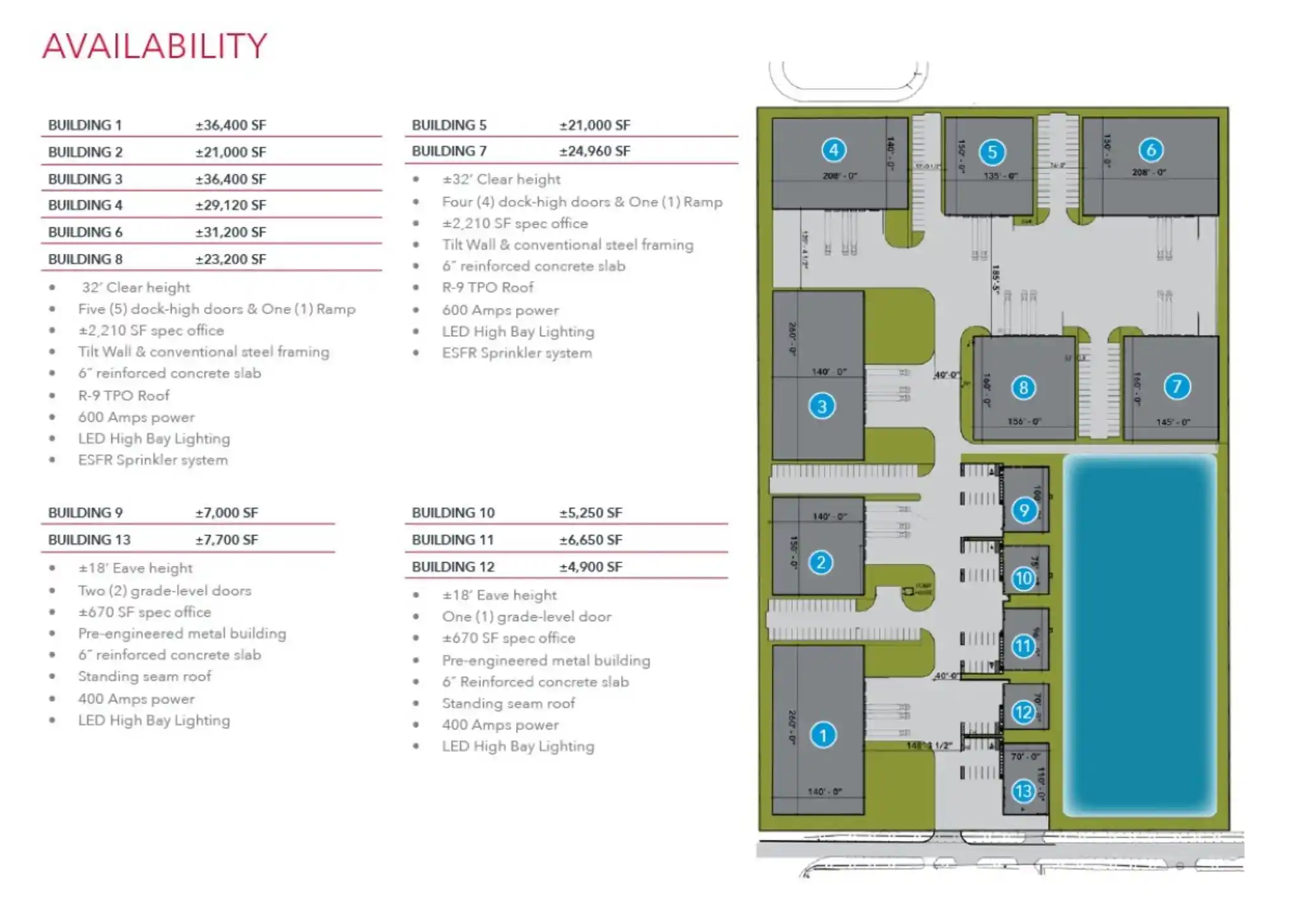 | Building 1 — ±36,400 SF Building 2 — ±21,000 SF Building 3 — ±36,400 SF Building 4 — ±29,120 SF Building 6 — ±31,200 SF Building 8 — ±23,200 SF 32’ clear height (5) dock-high doors + (1) ramp ±2,210 SF spec office Tiltwall / steel frame 6” reinforced concrete slab R-9 TPO roof 600 amps power LED high bay lighting ESFR sprinklers | Building 5 — ±21,000 SF Building 7 — ±24,960 SF (4) dock-high doors + (1) ramp ±2,210 SF office 32’ clear height Tiltwall / steel frame 600 amps power ESFR | Building 9 — ±7,000 SF Building 10 — ±5,250 SF Building 11 — ±6,650 SF Building 12 — ±4,900 SF Building 13 — ±7,700 SF 18’ eave height (2) grade-level doors ±670 SF office Pre-engineered metal 6” reinforced slab Standing seam roof 400 amps power LED high bay lighting |